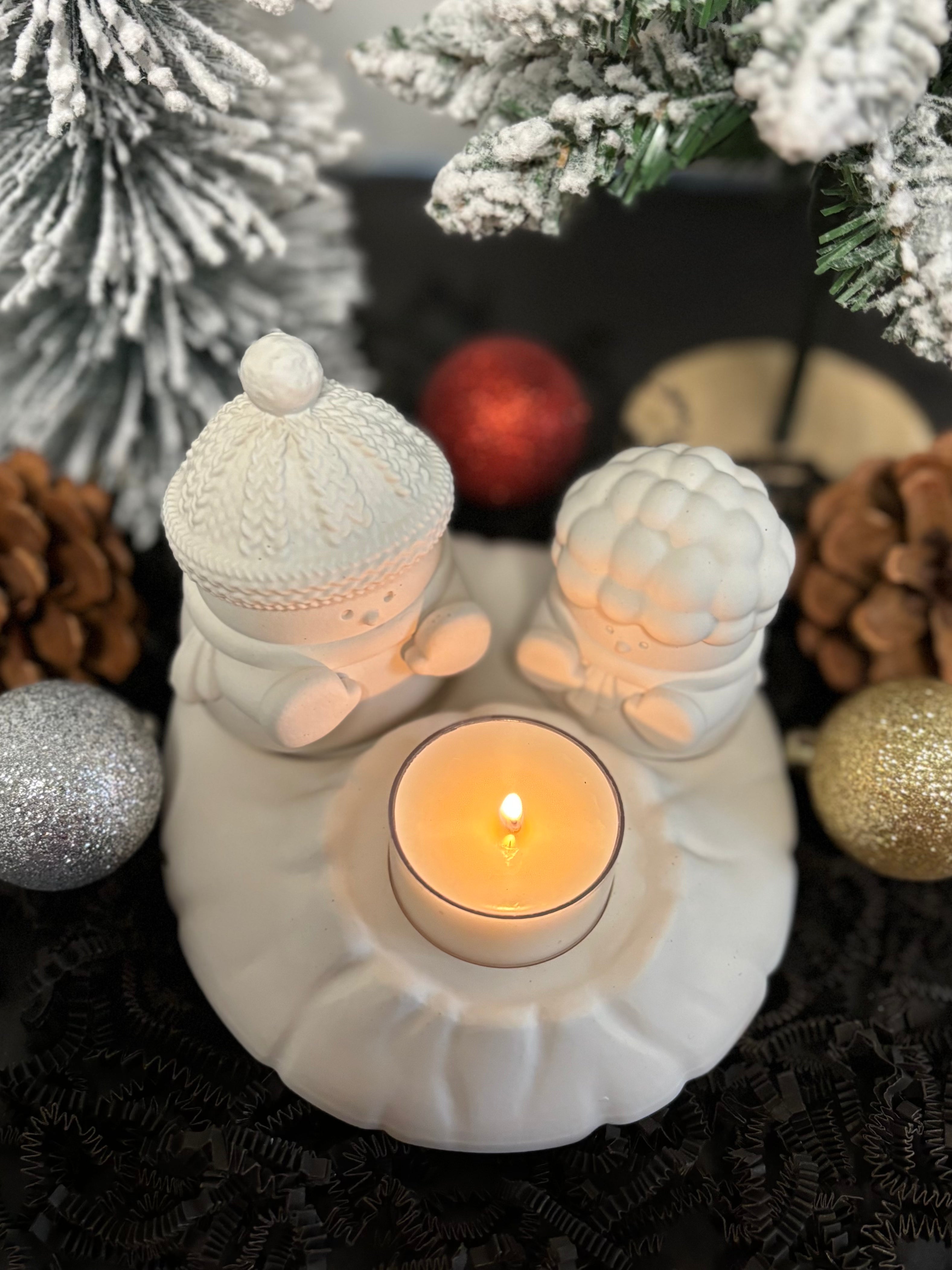 Cozy up this winter with our handmade Campfire Snowman Tea Light Holder Gift Set - a charming one of a kind piece you wont find in stores. Each snowman is hand-poured from eco-friendly gypsum cement and paired with four seasonal soy/beeswax blend tea lights, plus classic wooden matches in a timeless glass case. Thoughtfully crafted to capture the warmth of a winter campfire, this limited edition set is available only for the holiday/winter season. The perfect gift or cozy accent for your holiday home. Add warmth to your winter decor today- limited quantities available before they melt away!