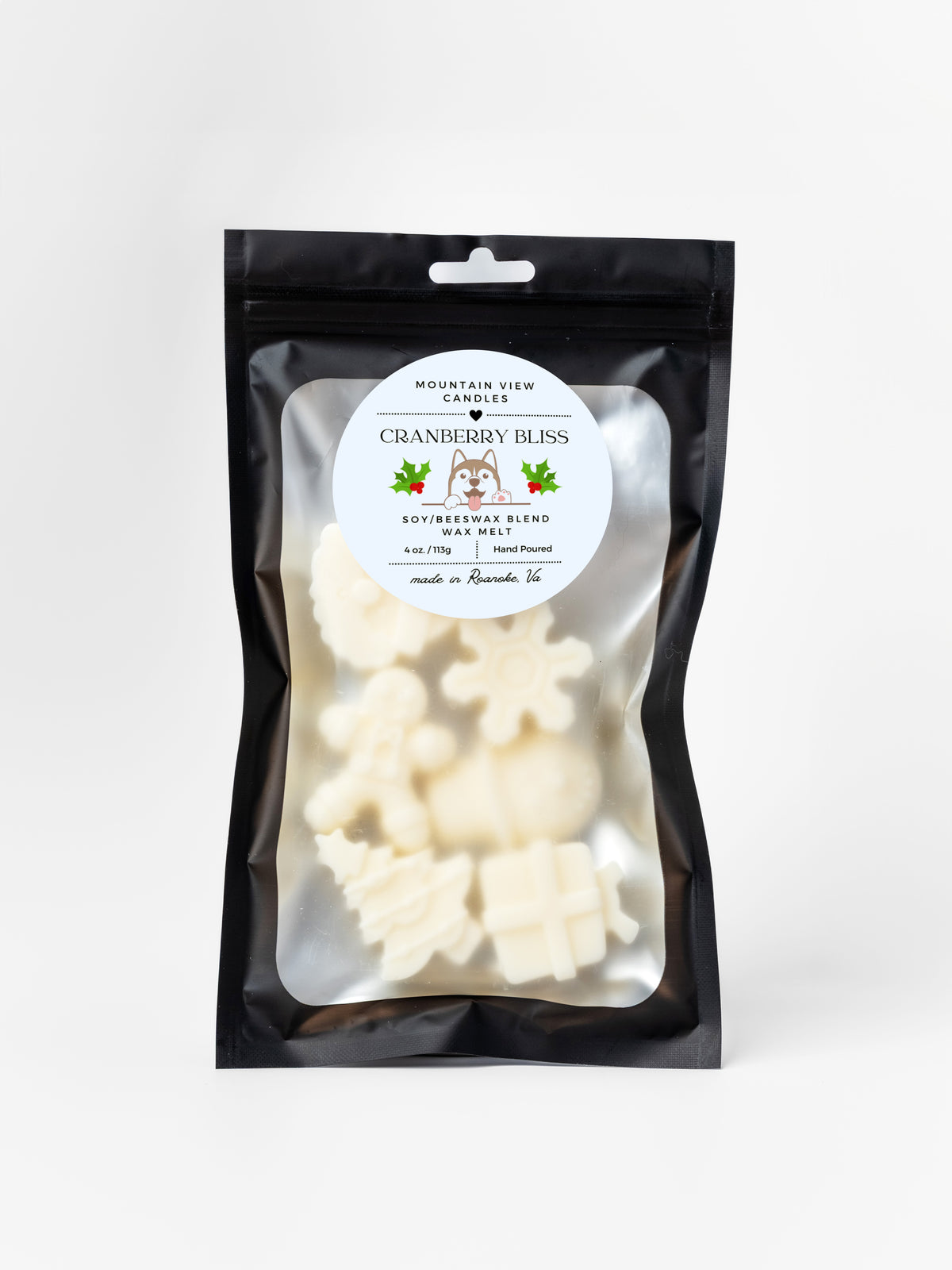 These adorable holiday shaped soy/beeswax blend wax melts are made with phthalate-free fragrance/essential oil blends. They are packaged in a matte black resealable mylar bag with a clear window.