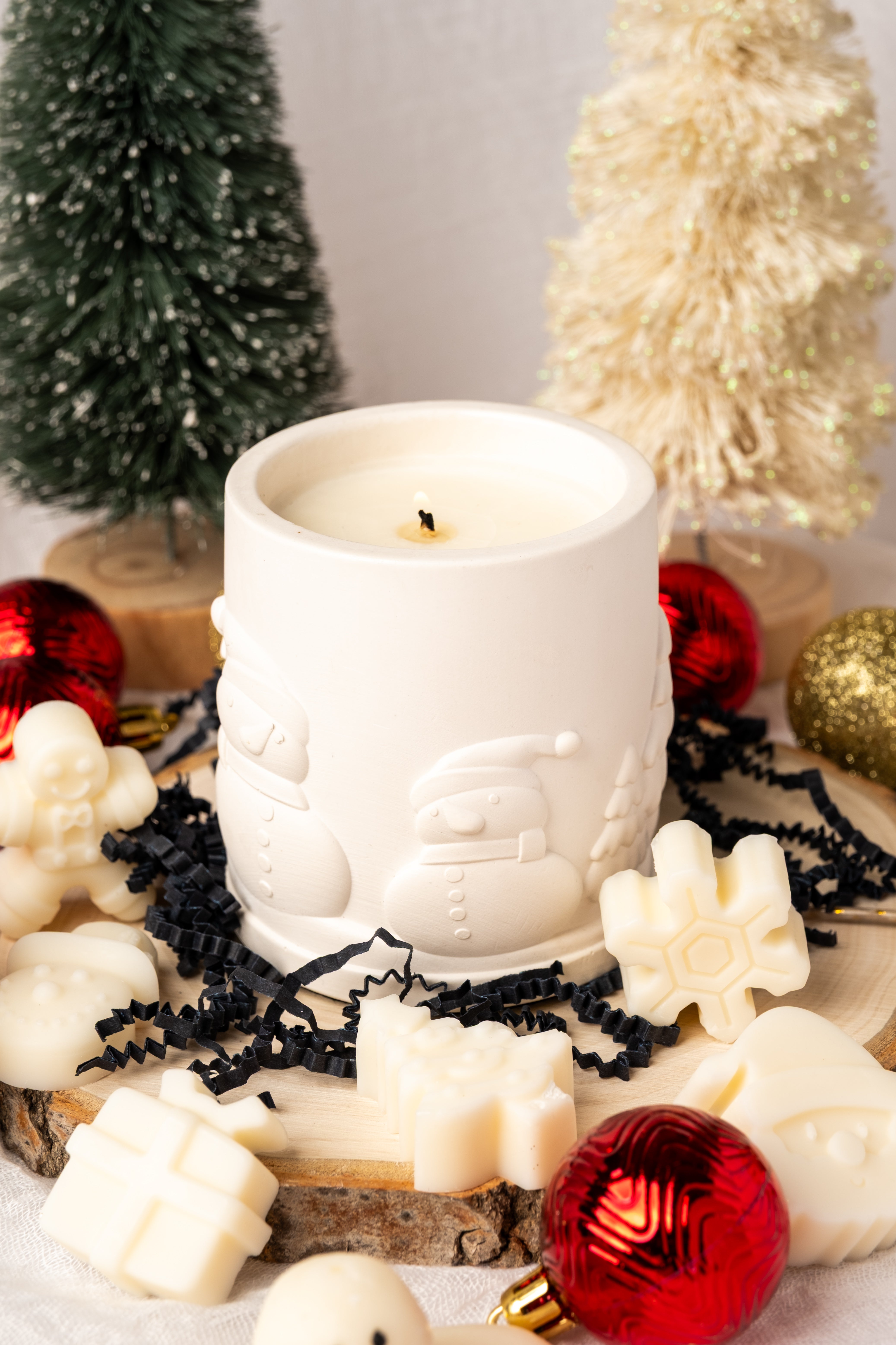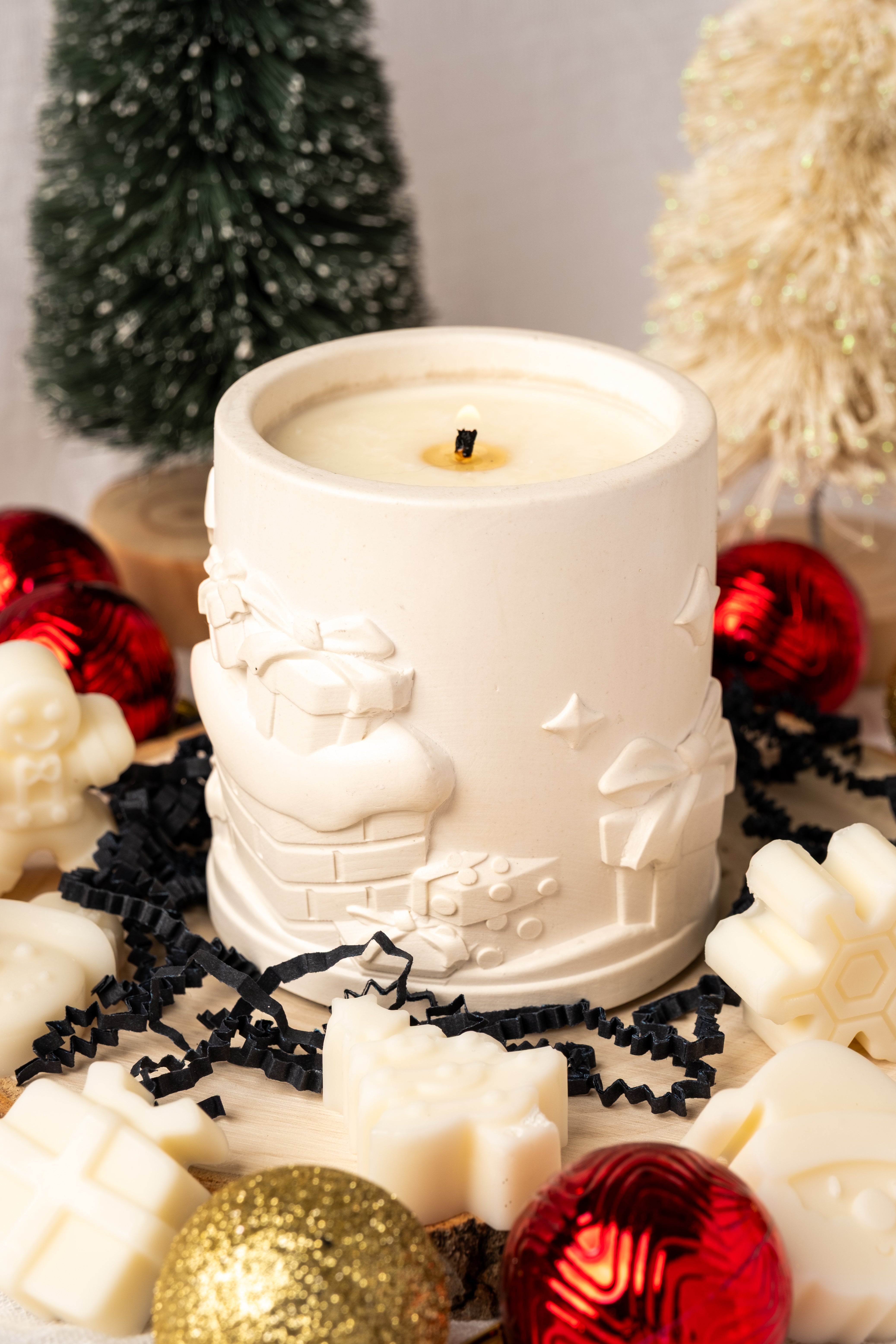 Bring a touch of handcrafted holiday magic to your home. Each stone candle vessel is lovingly handmade and available in three charming designs - Snowman, Santa's Sleigh, or Holiday Stocking - making every piece truly one of a kind. Choose from our signature scents: Yuletide, Mistletoe, Cranberry Bliss or Holiday Pine. Each hand-poured to fill your space with cozy, festive warmth. These exclusive holiday candles aren't found in stores and are available for a limited time only this season - perfect for gifting or creating your own winter wonderland glow. Each vessel is crafted with eco-friendly and sustainable gypsum cement.